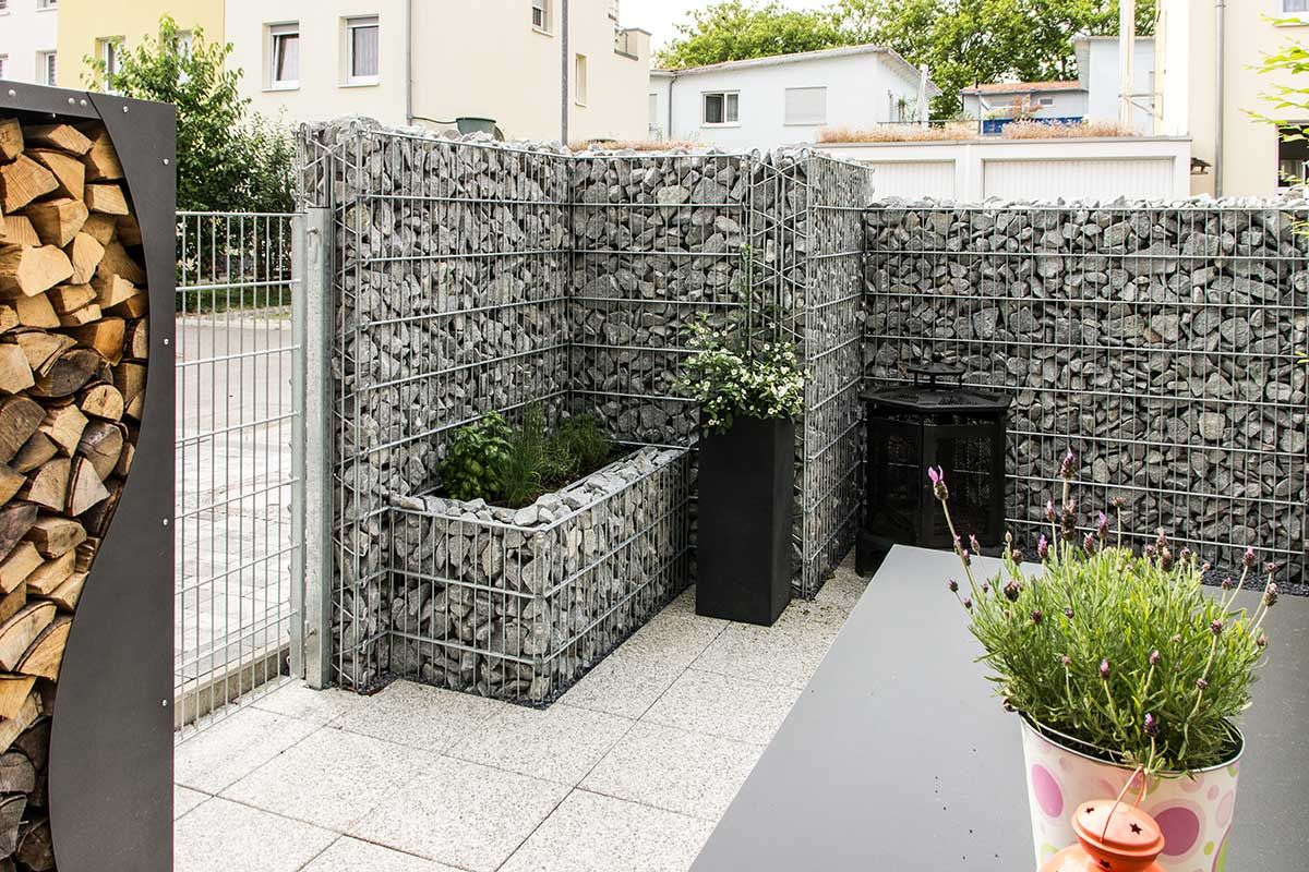 Mit Hilfe von Gabionen lassen sich langlebige Sichtschutzlösungen realisieren. Wie man in diesem Beispiel schön sehen kann, müssen Gabionen nicht langweilig und erdrückend wirken. Man kann durchaus auch Leichtigkeit und Spannung erzeugen.